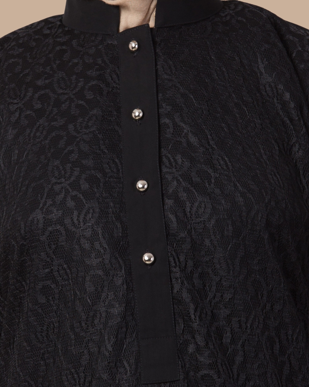 The design showcases a beautiful textured pattern across the front panel, adding depth and a subtle decorative element while keeping the overall look minimal and refined. A structured collar and elegant button placket enhance the design, creating a stylish focal point that adds a modern touch to the traditional abaya silhouette.