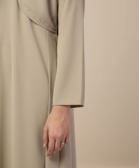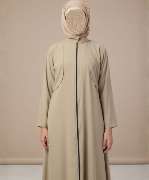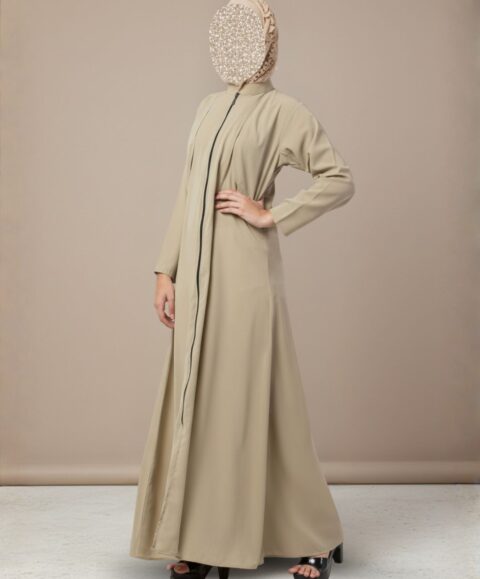 The Beige Minimalist Zipper Abaya is designed for the modern woman who values both convenience and a clean, architectural aesthetic. This piece stands out with its neutral sandy tone, providing a versatile base for any wardrobe.