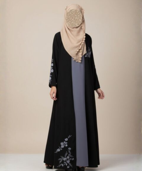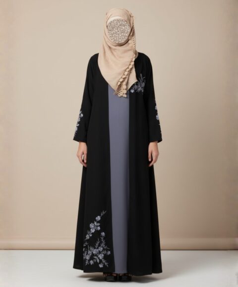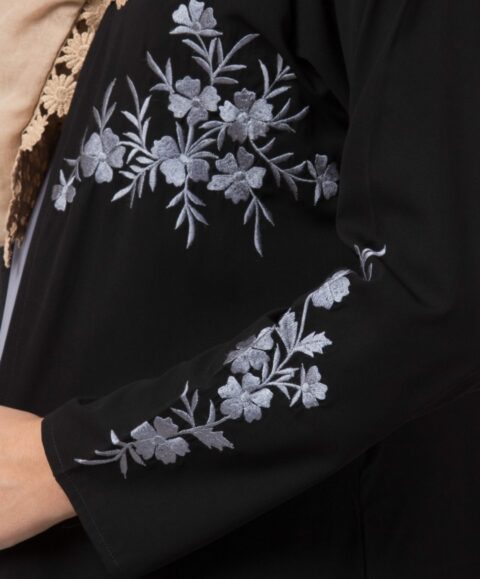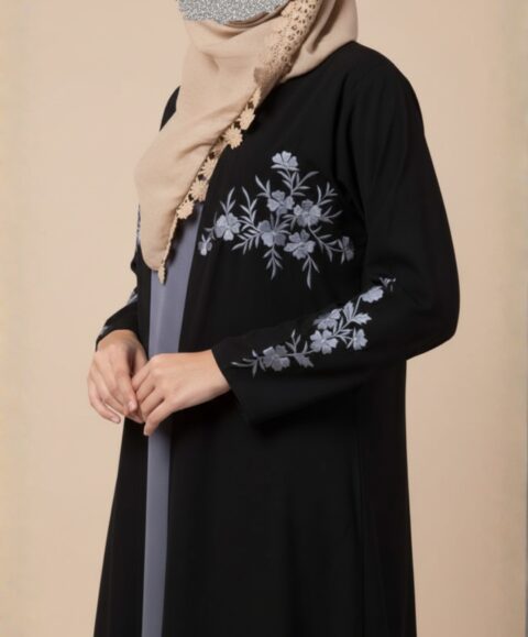 The design showcases a flowing open-front outer abaya adorned with delicate floral embroidery along the sleeves and lower front panel. The embroidery adds a refined artistic detail that enhances the overall design without overpowering its minimalist aesthetic. The outer abaya is paired with a coordinated inner dress in a soft contrasting tone, creating a layered look that adds depth and sophistication.