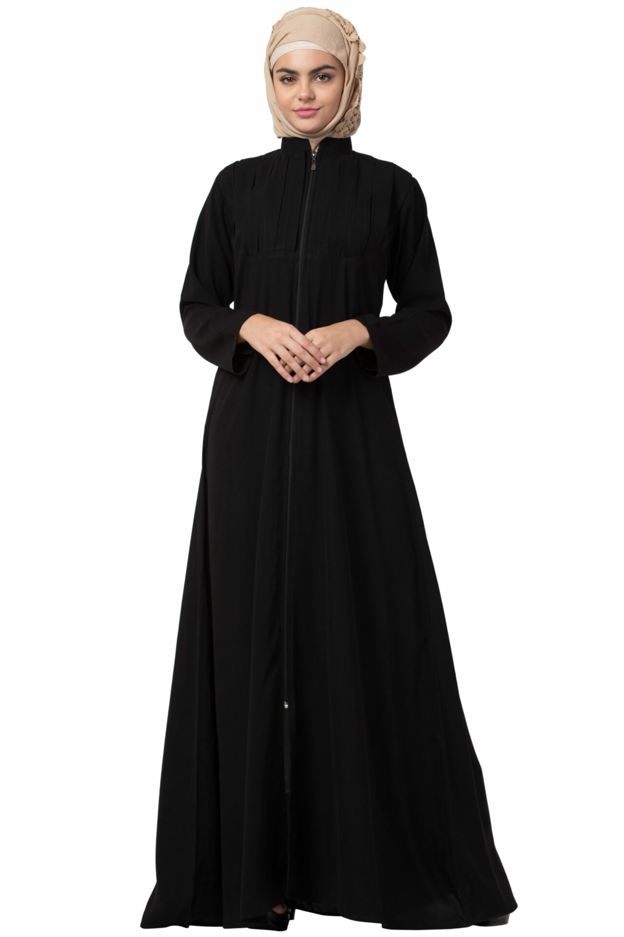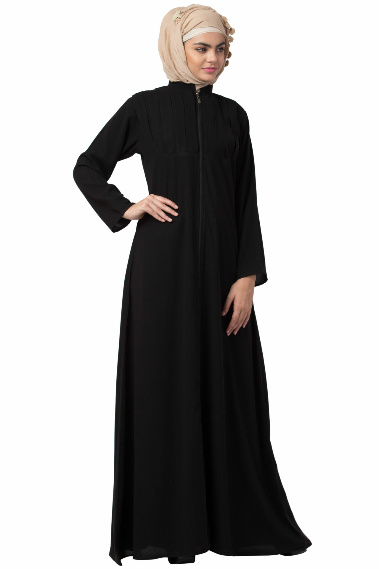 Full Zipper Shoulder Pleated Beige Abaya