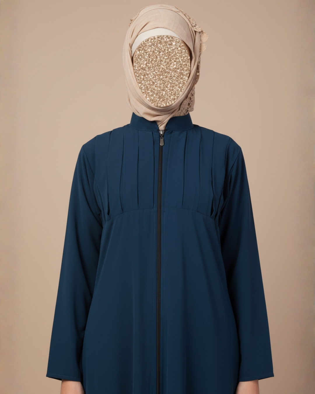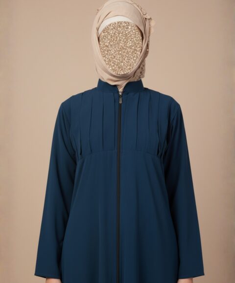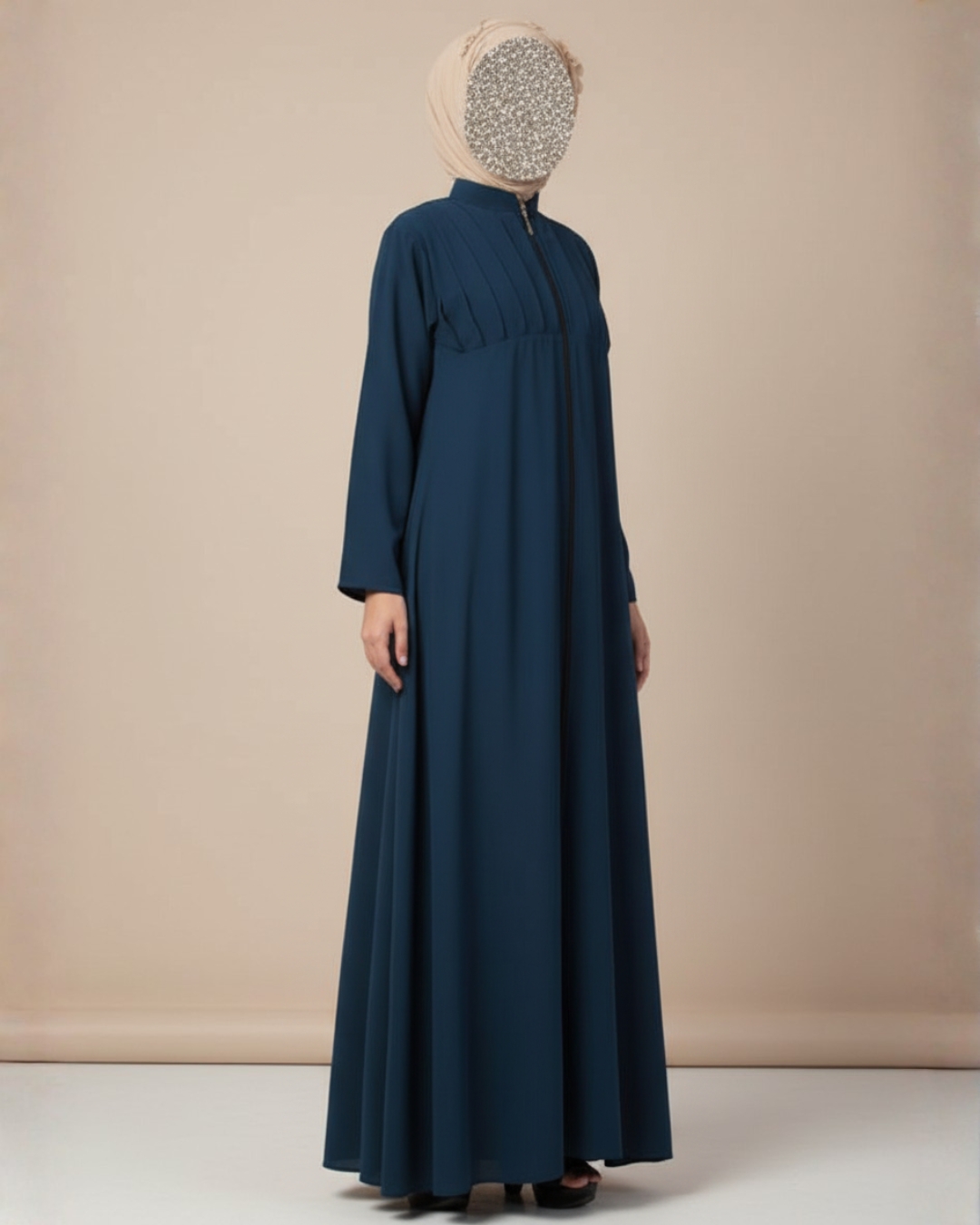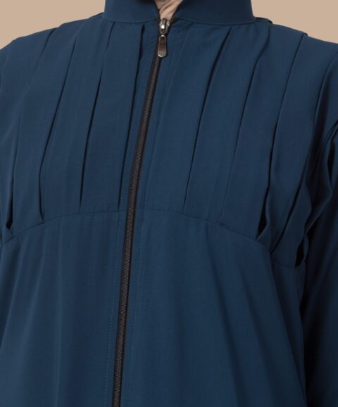 The design features beautiful pleated detailing on the front panel, adding a subtle yet sophisticated texture to the abaya. The front zipper closure makes it easy to wear and practical for daily use while maintaining a clean and elegant appearance.