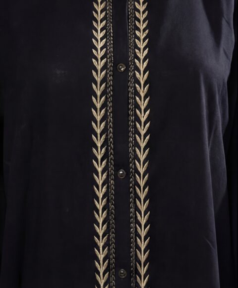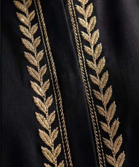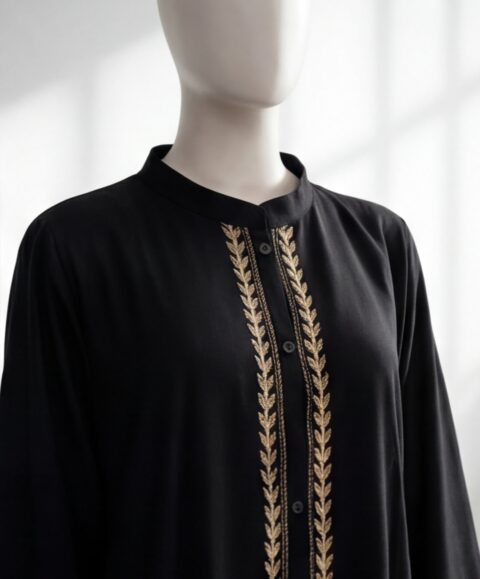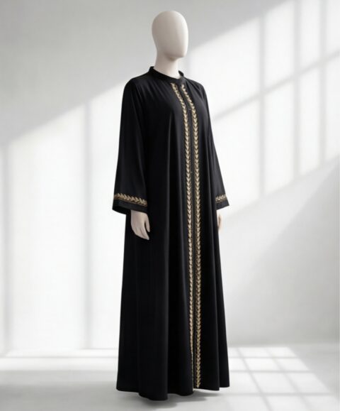 Elevate your modest wardrobe with this stunning Black Front-Open Abaya. Featuring intricate gold leaf embroidery along the front panel and cuffs, this A-line silhouette offers a perfect blend of traditional grace and modern sophistication. Crafted from breathable, high-quality fabric, it is designed for both comfort and style.