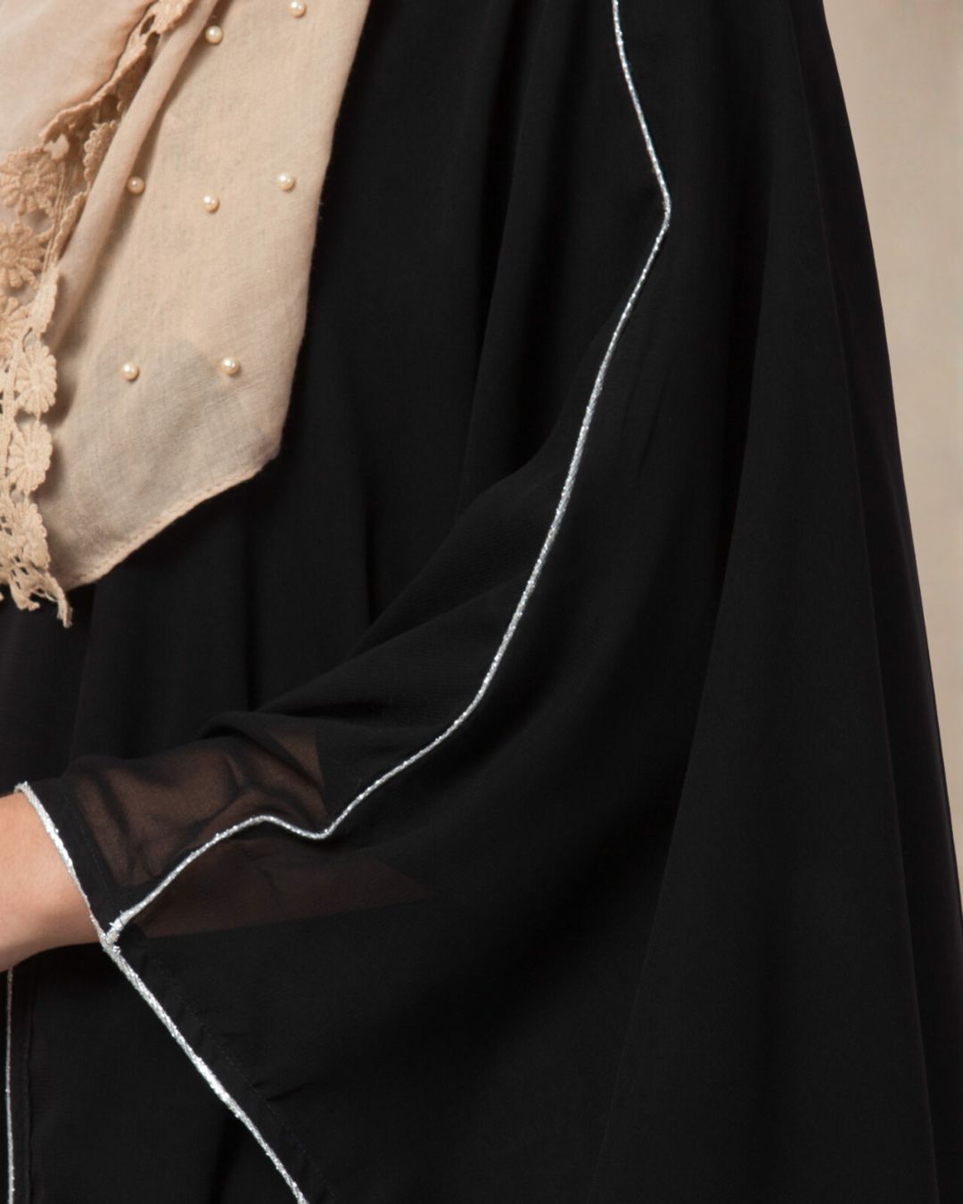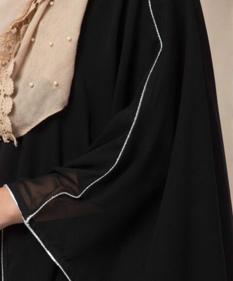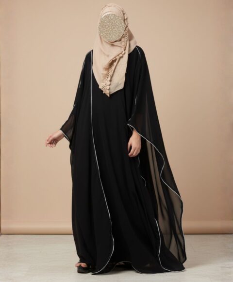 Crafted from high-quality matte crepe, the garment offers a smooth, luxurious hand-feel and a substantial drape that prevents the fabric from clinging. The deep black hue is beautifully accentuated by fine white piping that outlines the dramatic, sweeping sleeves, adding a touch of contemporary definition to the traditional Farasha style.